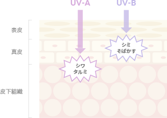 主に表皮に強く作用して、赤く炎症をおこしたり、メラニン色素を増加させて日やけによる シミ・そばかすの原因をつくります。